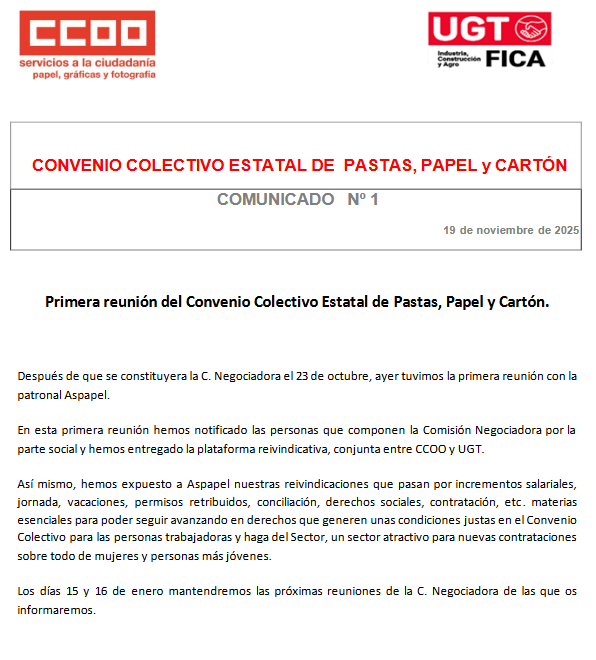 Comunicado 6 2023: Alcanzado acuerdo final Convenio Estatal Pastas, Papel y Cartón 2023-2025