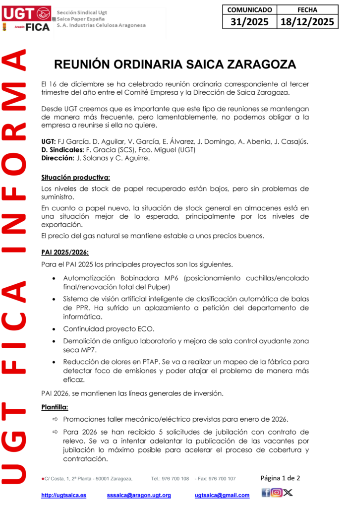 El 16 de diciembre se ha celebrado reunión ordinaria correspondiente al tercer trimestre del año entre el Comité Empresa y la Dirección de Saica Zaragoza.