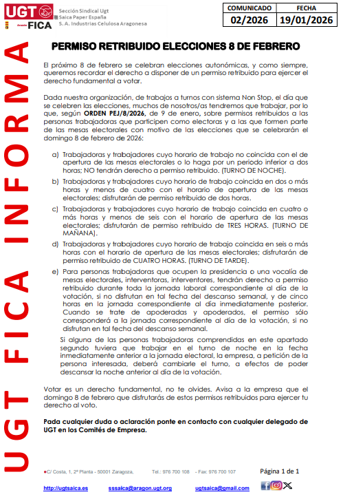 Dada nuestra organización, de trabajos a turnos con sistema Non Stop, el día que se celebren las elecciones, muchos de nosotros/as tendremos que trabajar, por lo que, según ORDEN PEJ/8/2026, de 9 de enero, sobre permisos retribuidos a las personas trabajadoras que participen como electoras y a las que formen parte de las mesas electorales con motivo de las elecciones que se celebrarán el domingo 8 de febrero de 2026: