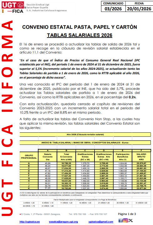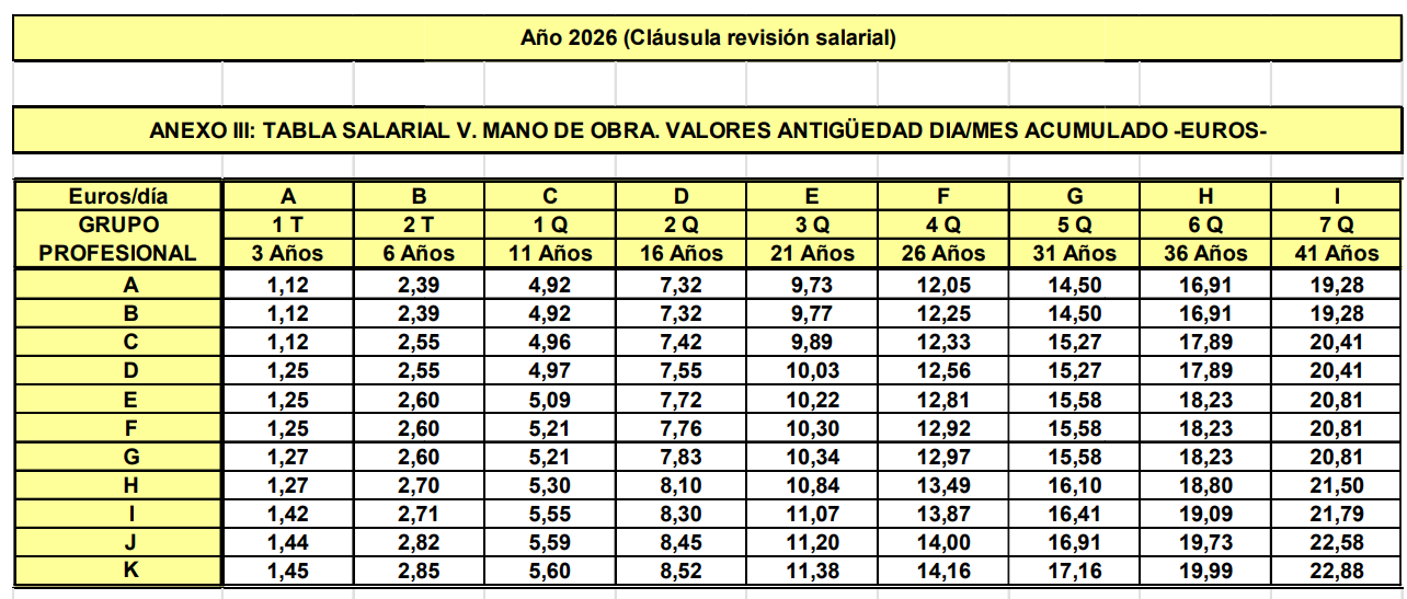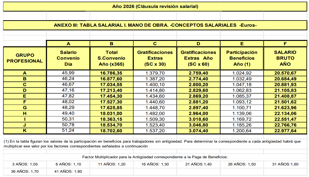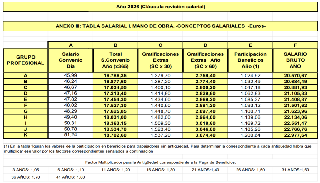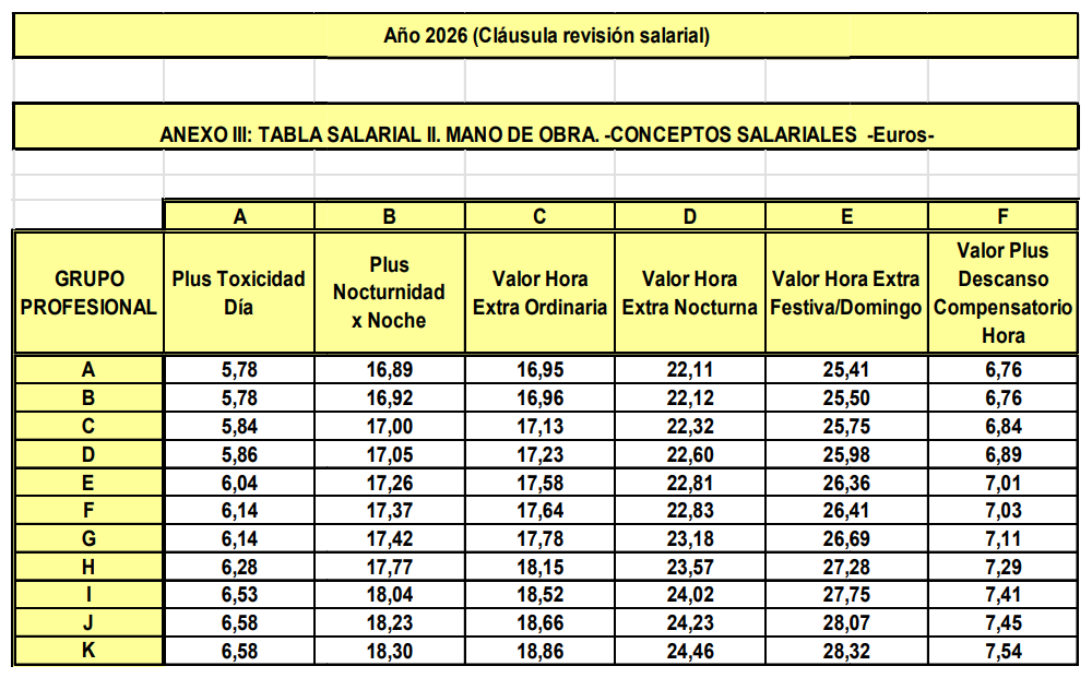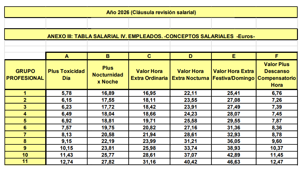 El 16 de enero se procedió a actualizar las tablas de salida de 2026 tal y como se recoge en la cláusula de revisión salarial establecida en el artículo 11.1 del Convenio: