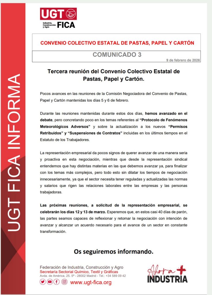 Comunicado 3 Mesa Negociadora Convenio Estatal Pastas Papel y Cartón