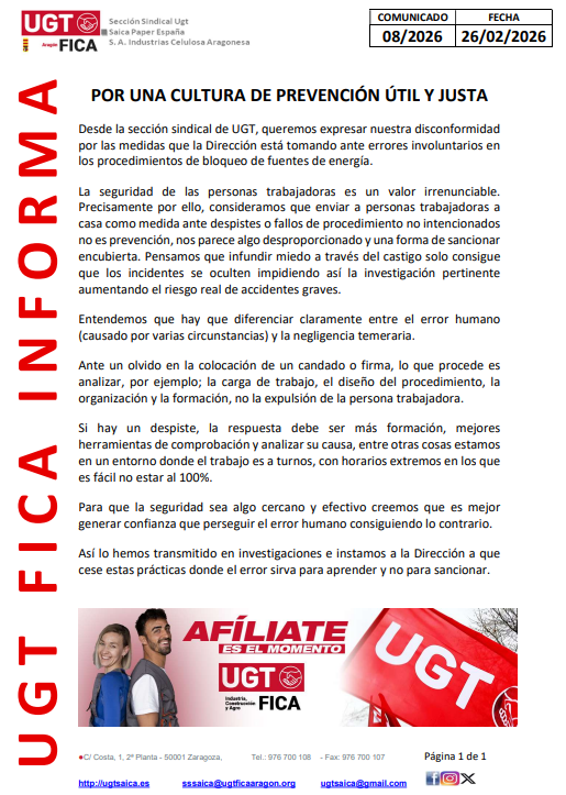 Desde la sección sindical de UGT, queremos expresar nuestra disconformidad por las medidas que la Dirección está tomando ante errores involuntarios en los procedimientos de bloqueo de fuentes de energía.