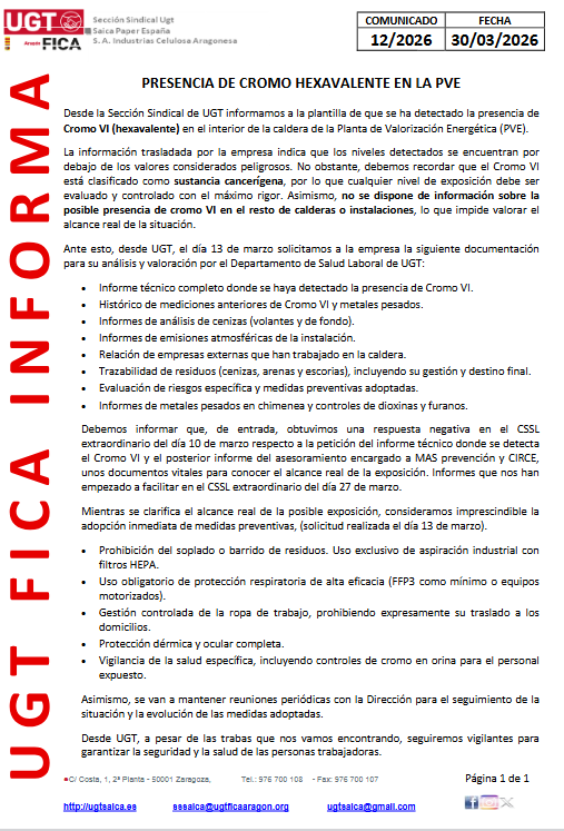 Desde la Sección Sindical de UGT informamos a la plantilla de que se ha detectado la presencia de Cromo VI (hexavalente) en el interior de la caldera de la Planta de Valorización Energética (PVE).
